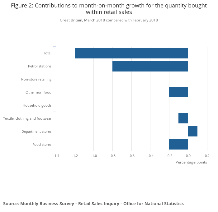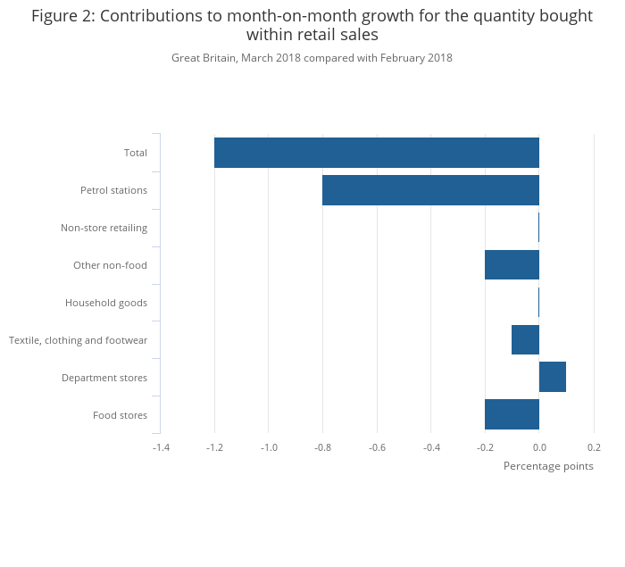 Image .csv .xlsIn March 2018, there was a negative contribution of 1.2 percentage points for the quantity bought in retail sales when compared with February 2018. Department stores were the only positive contribution to retail sales at 0.1 percentage points and while non-store retailing and household goods stores remained flat, all other sectors showed a fall on the month. As seen in Table 2, petrol sales fell by 7.4%, providing the greatest contribution to the overall decline at negative 0.8 percentage points. This could be attributed to less travel within March due to the snow and adverse weather experienced across the country (Section 6).