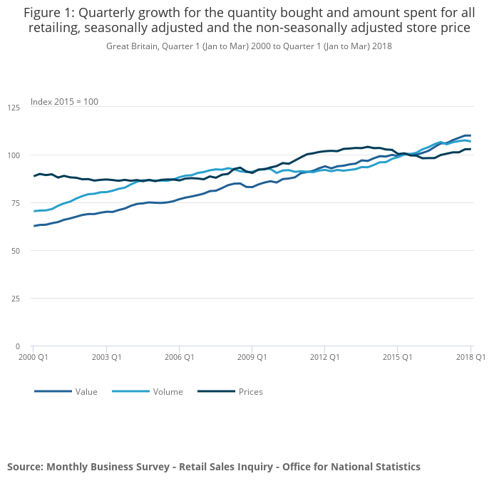 In the three months to March 2018 (Quarter 1), the quantity bought in retail sales fell by 0.5% when compared with Quarter 4 (Oct to Dec) 2017, with declines in all sectors except for department stores and non-store retailing.