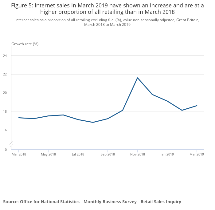 Download this chart Figure 5: Internet sales in March 2019 have shown an increase and are at a higher proportion of all retailing than in March 2018