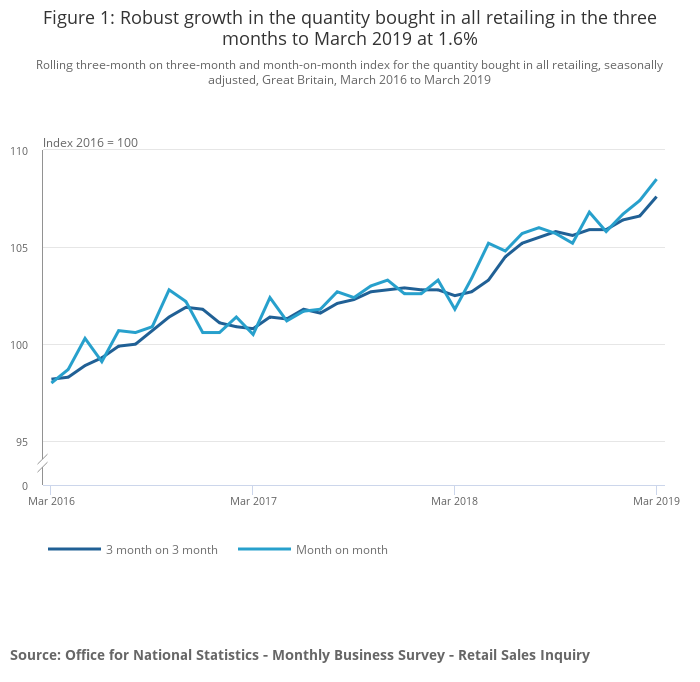 Figure 1: Robust growth in the quantity bought in all retailing in the three months to March 2019 at 1.6%