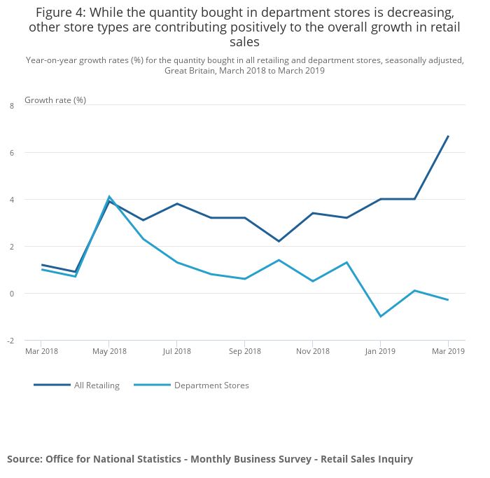 Department stores were the only store type to decrease in the quantity bought when compared with March 2018, with a fall of 0.3% in March 2019.