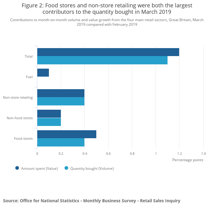 The quantity bought in March 2019 increased by 1.1% on the month, with food stores and non-store retailing providing the largest contributions to this growth.