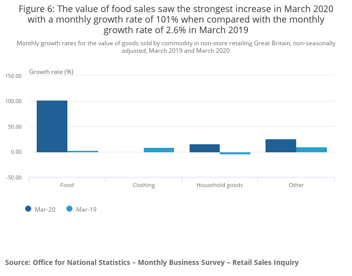 Figure 6: The value of food sales saw the strongest increase in March 2020 with a monthly growth rate of 101% when compared with the monthly growth rate of 2.6% in March 2019