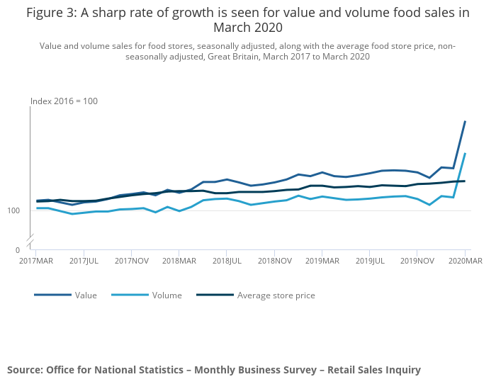 Figure 3: A sharp rate of growth is seen for value and volume food sales in March 2020
