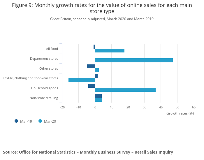 Image .csv .xlsDepartment stores saw a strong monthly increase of 47.4% in March 2020, compared with a slight increase of 0.1% in March 2019. Household goods stores also saw a strong increase, at 36.9% in March 2020 compared with the monthly decline of negative 4.1% in March 2019. These stores commented on the increased sales of fridge-freezers purchased online in March. This was also commented in the BBC online article .
