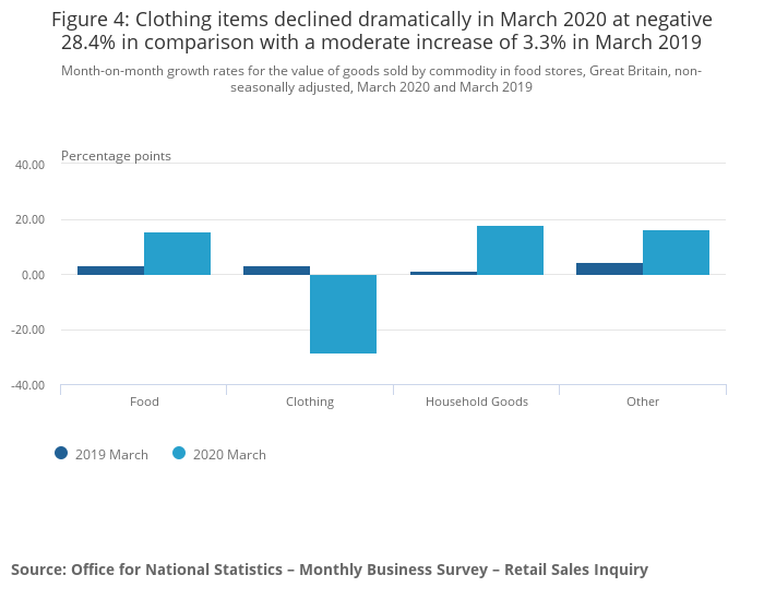 Figure 4: Clothing items declined dramatically in March 2020 at negative 28.4% in comparison with a moderate increase of 3.3% in March 2019