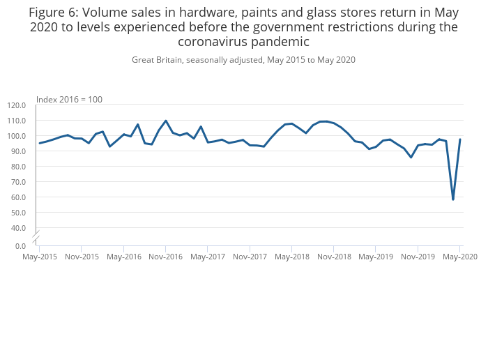 Figure 6: Volume sales in hardware, paints and glass stores return in May 2020 to levels experienced before the government restrictions during the coronavirus pandemic