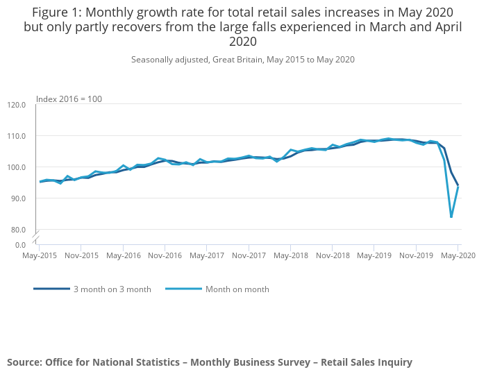 While we see some partial bounce back on the monthly growth rate in May 2020 at 12.0%, levels of sales do not recover from the strong falls seen in March and April 2020 and are still down by 13.1% on February 2020 before the impact of the coronavirus pandemic.