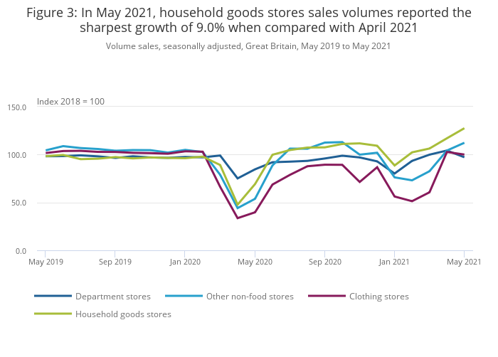 Non-food stores reported a 2.3% increase in monthly sales volumes in May 2021 with household goods stores (for example, hardware and furniture stores) and “other” non-food stores reporting the largest growth of 9.0% and 7.7% respectively.
