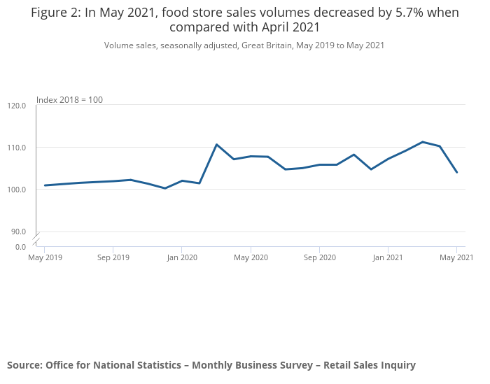 Figure 2: In May 2021, food store sales volumes decreased by 5.7% when compared with April 2021