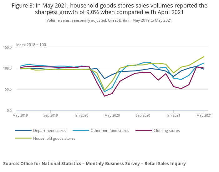 Figure 3: In May 2021, household goods stores sales volumes reported the sharpest growth of 9.0% when compared with April 2021