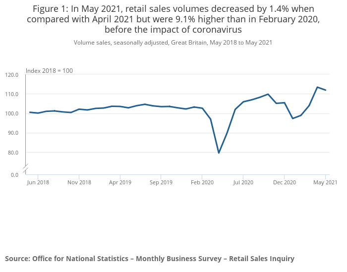 Figure 1: In May 2021, retail sales volumes decreased by 1.4% when compared with April 2021 but were 9.1% higher than in February 2020, before the impact of coronavirus