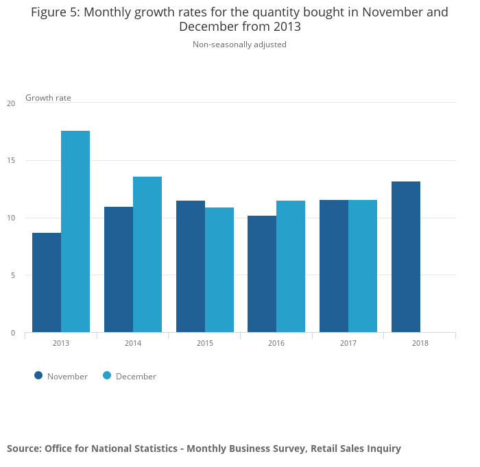 Retailers reported strong growth on the month due to Black Friday promotions in November, which continues the shifting pattern in consumer spending to sales occurring earlier in the year; the non-seasonally adjusted growth rate in November 2018 was 13.2% in comparison with 8.7% in November 2013.