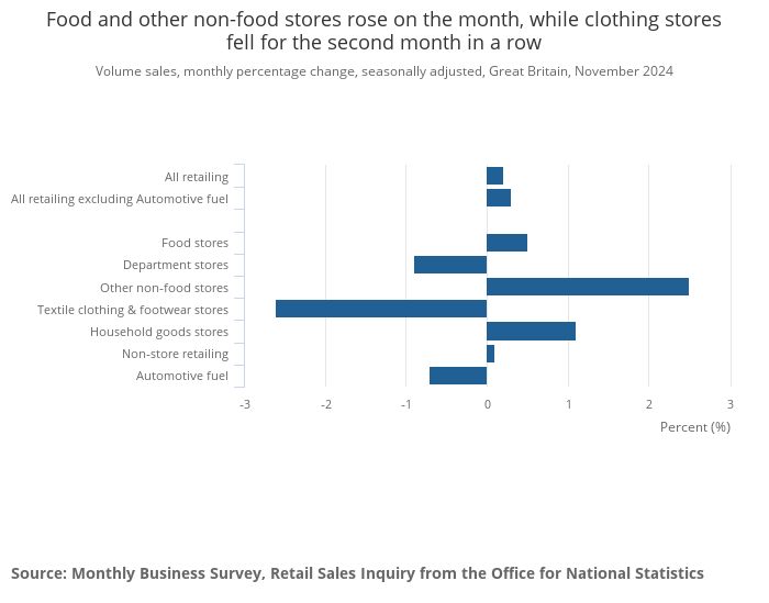 Non-food stores sales volumes - the total of department, clothing, household and other non-food stores - rose 0.2% over the month with a strong positive contribution from other retail sales (not elsewhere specified). This sub-sector rose by 7.9% in November, rebounding from a 7.1% fall in October 2024. Household goods stores rose by 1.1%, with furniture stores having the largest upward contribution to growth.