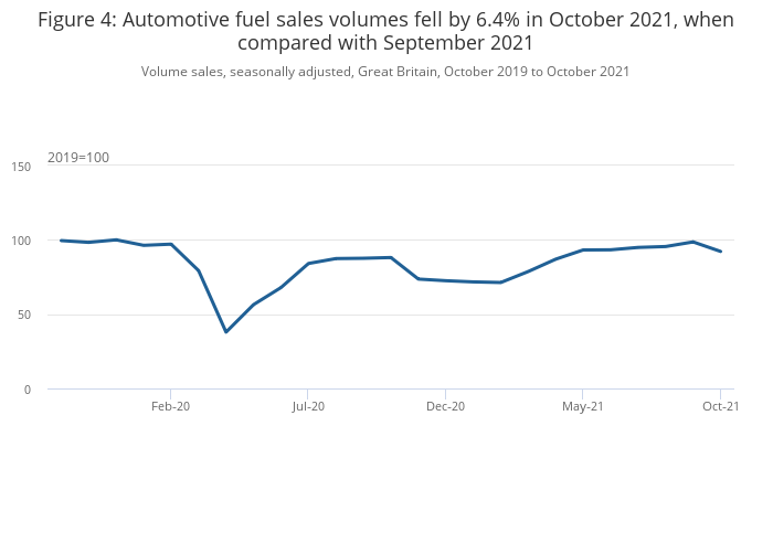 Automotive fuel sales volumes fell by 6.4% in October 2021 as they returned to more typical recent levels following strong growth in September; volumes were 5.0% below their February 2020 levels.