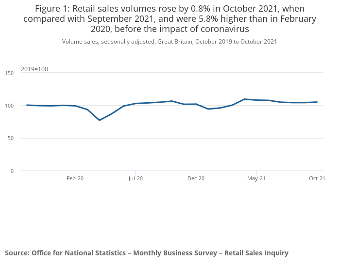 Retail sales volumes rose by 0.8% in October 2021, from a revised unchanged (0.0%) position between August and September (previous estimate was a 0.2% fall); volumes were 5.8% higher than their pre-coronavirus (COVID-19) pandemic February 2020 levels.
