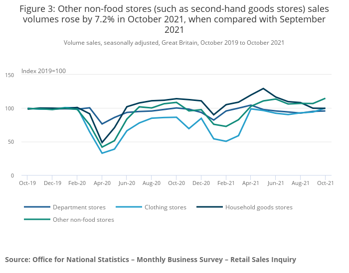 The sub-sector, other non-food stores, reported a monthly rise in sales volumes of 7.2% in October 2021. Within this, second-hand goods stores (charity shops and auction houses) had the largest contribution, followed by sports equipment, games and toy stores.