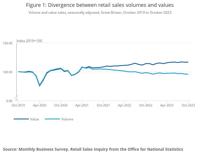 Retail sales volumes in October 2023 were at their lowest level since February 2021 when there were widespread and extensive restrictions to non-essential retail in England, Scotland and Wales.