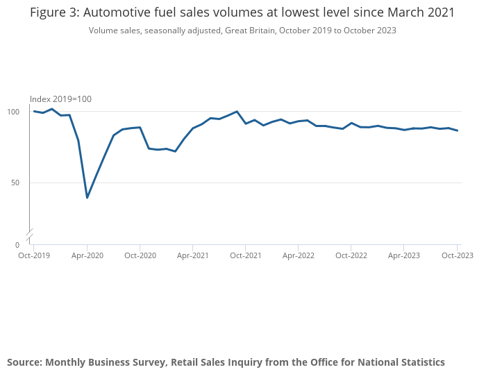 Despite some recent volatility in the monthly data series, in the three months to October 2023, sales volumes fell by 0.7% when compared with the previous three months. This may be because of the increasing price of fuel since July 2023 as reported by the Department for Energy Security and Net Zero in their Weekly road fuel prices release.