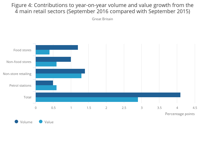Download this chart Figure 4: Contributions to year-on-year volume and value growth from the 4 main retail sectors (September 2016 compared with September 2015)