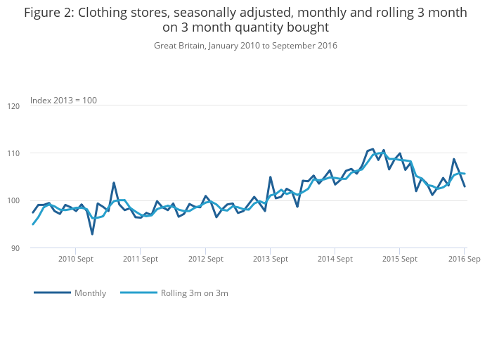Image .csv .xlsIn the latest month, growth continues to be driven by a broad-based increase in all 4 categories but more notably in food and non-food stores, contributing 1.8 percentage points and 1.7 points respectively to the 5.5% growth in retail sales in September 2016. Although food growth has been volatile in the last 9 years, there has been a continuous increase of growth over the recent months. This upward trend in food sales is supported by the British Retail Consortium and KPMG suggesting it has been the best quarter for food since 2013.