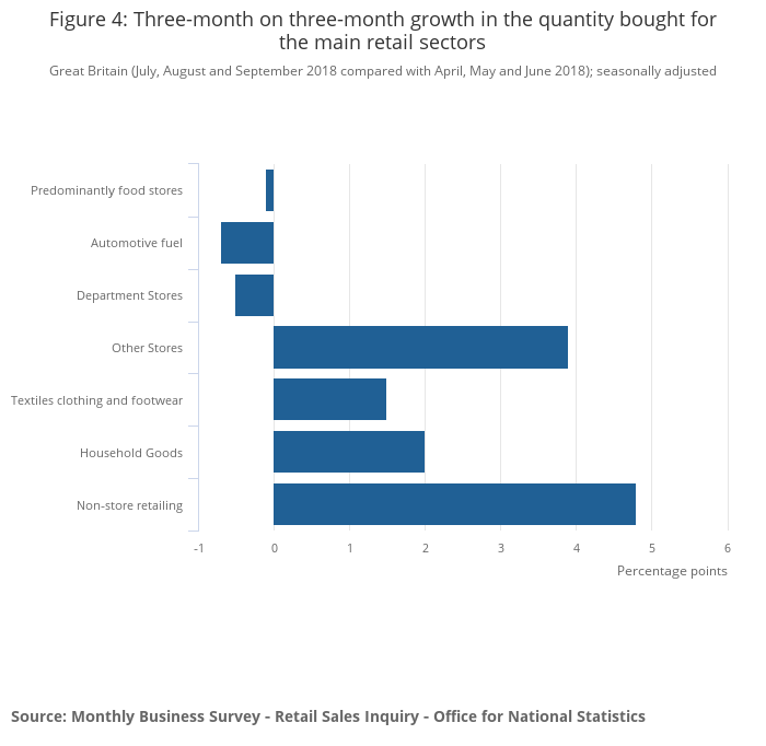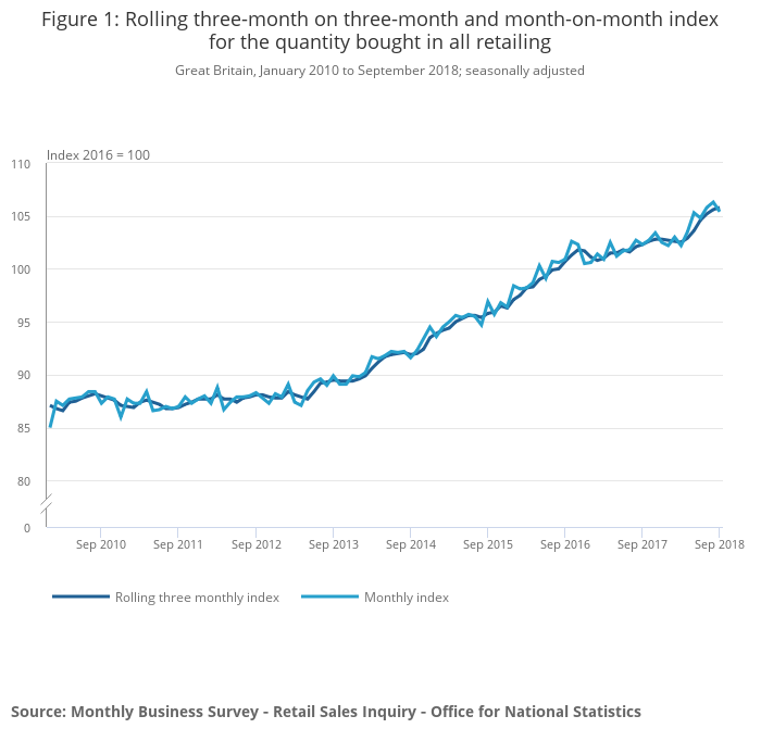 In the three months to September 2018, the quantity bought in retail sales increased by 1.2% when compared with the previous three months, with strong sales in “other stores” and online retailing.