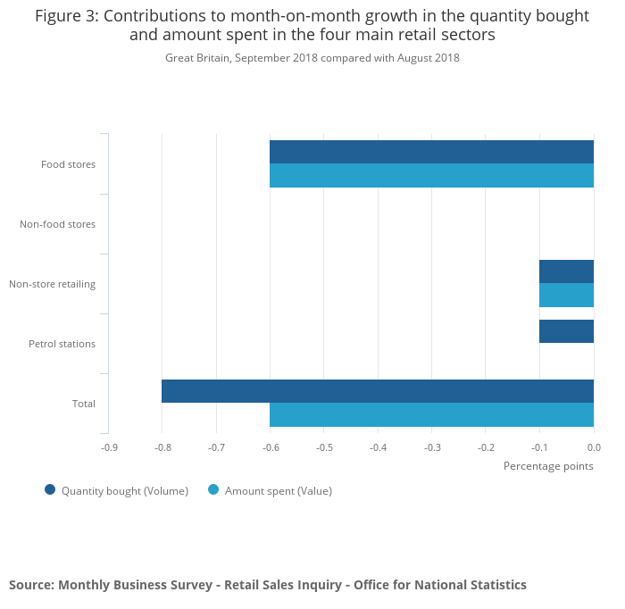 Food stores were the largest contributor towards the overall fall, with the amount spent and quantity bought both having a negative percentage point change of 0.6.