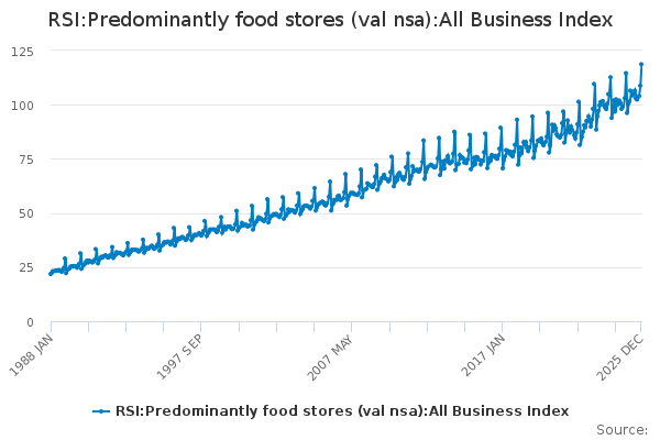 Download this time seriesRSI:Predominantly food stores (val nsa):All Business Index