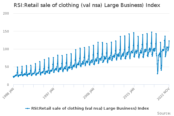 Download this time seriesRSI:Retail sale of clothing (val nsa) Large Business) Index