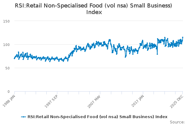 Download this time seriesRSI:Retail Non-Specialised Food (vol nsa) Small Business) Index