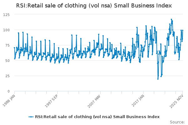 Download this time seriesRSI:Retail sale of clothing (vol nsa) Small Business Index