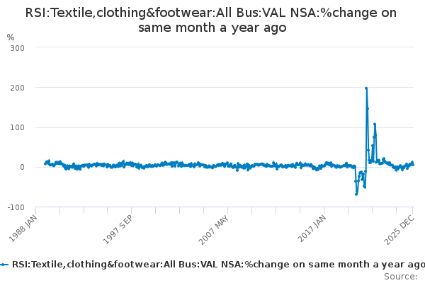 Download this time seriesRSI:Textile,clothing&footwear:All Bus:VAL NSA:%change on same month a year ago
