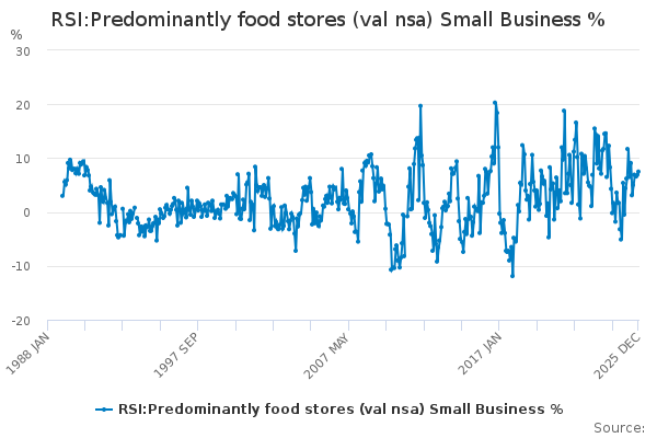 Download this time seriesRSI:Predominantly food stores (val nsa) Small Business %