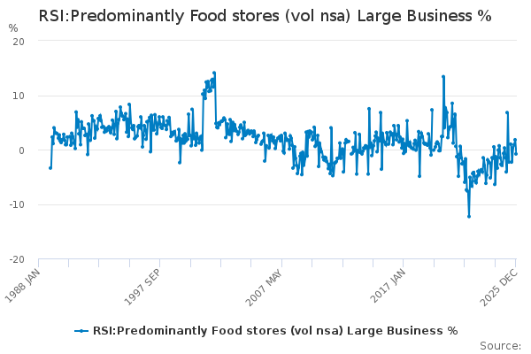 Download this time seriesRSI:Predominantly Food stores (vol nsa) Large Business %
