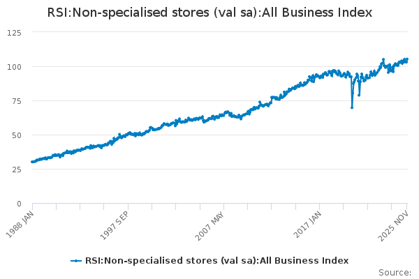 Download this time seriesRSI:Non-specialised stores (val sa):All Business Index