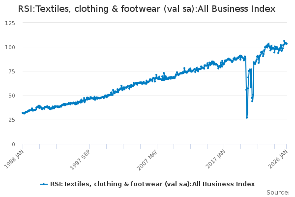 Download this time seriesRSI:Textiles, clothing & footwear (val sa):All Business Index