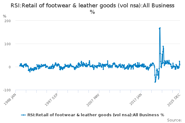 Download this time seriesRSI:Retail of footwear & leather goods (vol nsa):All Business %