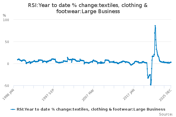Download this time seriesRSI:Year to date % change:textiles, clothing & footwear:Large Business