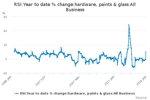 Download this time seriesRSI:Year to date % change:hardware, paints & glass:All Business