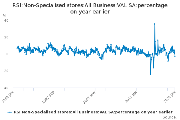 Download this time seriesRSI:Non-Specialised stores:All Business:VAL SA:percentage on year earlier