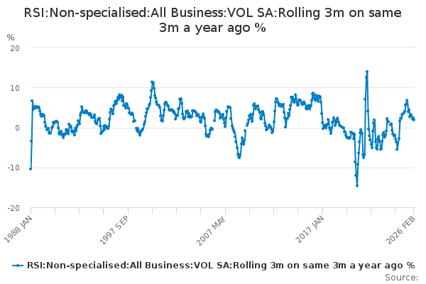 Download this time seriesRSI:Non-specialised:All Business:VOL SA:Rolling 3m on same 3m a year ago %