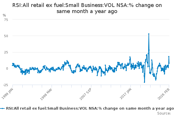 Download this time seriesRSI:All retail ex fuel:Small Business:VOL NSA:% change on same month a year ago