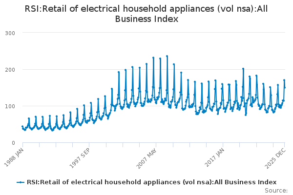 Download this time seriesRSI:Retail of electrical household appliances (vol nsa):All Business Index
