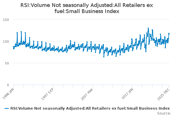 Download this time seriesRSI:Volume Not seasonally Adjusted:All Retailers ex fuel:Small Business Index