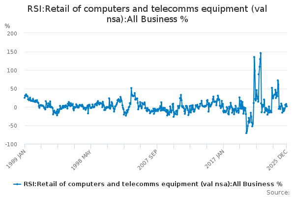 Download this time seriesRSI:Retail of computers and telecomms equipment (val nsa):All Business %