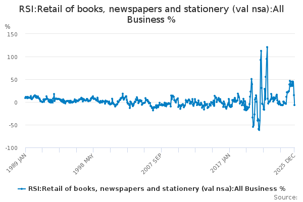 Download this time seriesRSI:Retail of books, newspapers and stationery (val nsa):All Business %