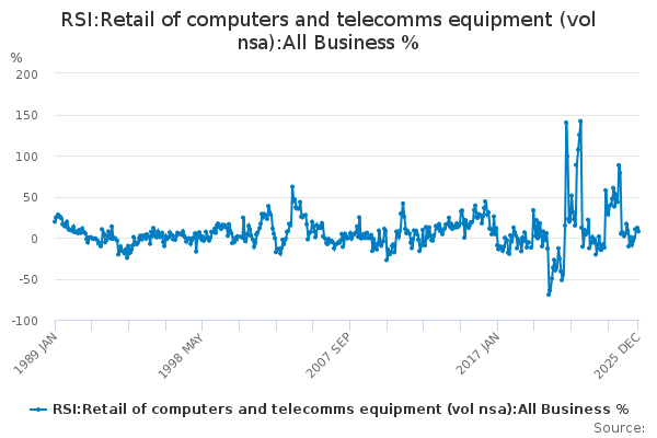 Download this time seriesRSI:Retail of computers and telecomms equipment (vol nsa):All Business %