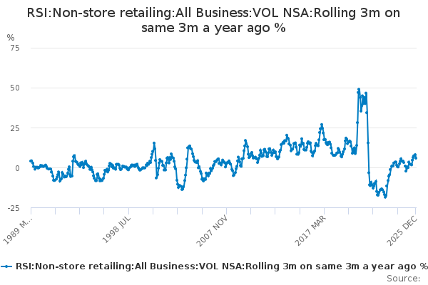 Download this time seriesRSI:Non-store retailing:All Business:VOL NSA:Rolling 3m on same 3m a year ago %