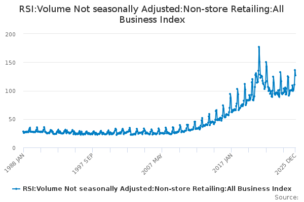 Download this time seriesRSI:Volume Not seasonally Adjusted:Non-store Retailing:All Business Index