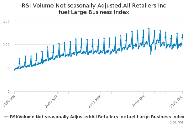 Download this time seriesRSI:Volume Not seasonally Adjusted:All Retailers inc fuel:Large Business Index